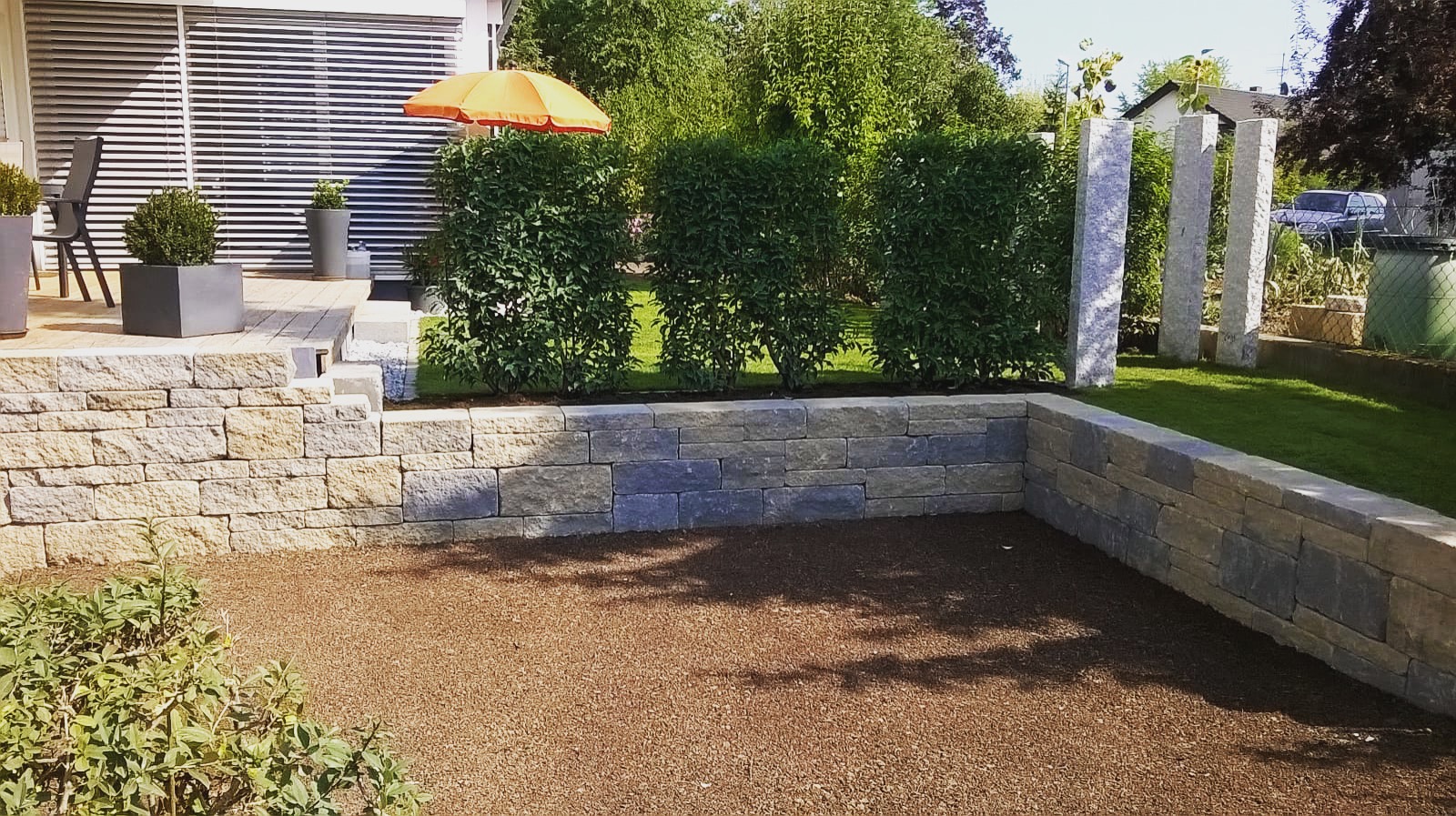 Mauerbau, Bepflanzung, Stelen – Garten Wölk